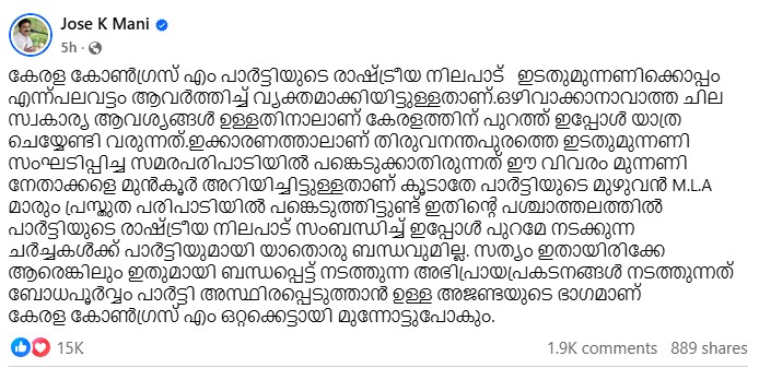കേരള കോണ്ഗ്രസ് എം ഇടതുമുന്നണി വിട്ടേക്കുമെന്ന വാര്ത്തകളോട് പ്രതികരിച്ച് കേരള കോണ്ഗ്രസ് എം ചെയര്മാന് ജോസ് കെ മാണി രംഗത്ത്. പാര്ട്ടിയുടെ രാഷ്ട്രീയ നിലപാട് സംബന്ധിച്ച് ഇപ്പോള് പുറമേ നടക്കുന്ന ചര്ച്ചകള്ക്ക് പാര്ട്ടിയുമായി യാതൊരു ബന്ധവുമില്ലെന്ന് ജോസ് കെ മാണി വ്യക്തമാക്കി. കേരള കോണ്ഗ്രസ് എം പാര്ട്ടിയുടെ രാഷ്ട്രീയ നിലപാട് പലവട്ടം ആവര്ത്തിച്ച് വ്യക്തമാക്കിയിട്ടുള്ളതാണ്- ജോസ് കെ മാണി ഫേസ്ബുക്ക് പോസ്റ്റിലൂടെ പറഞ്ഞു. കേരള കോണ്ഗ്രസ് എം പാര്ട്ടിയുടെ രാഷ്ട്രീയ നിലപാട് ഇടതുമുന്നണിക്കൊപ്പം എന്ന്പലവട്ടം ആവര്ത്തിച്ച് വ്യക്തമാക്കിയിട്ടുള്ളതാണ്.ഒഴിവാക്കാനാവാത്ത ചില സ്വകാര്യ ആവശ്യങ്ങള് ഉള്ളതിനാലാണ് കേരളത്തിന് പുറത്ത് ഇപ്പോള് യാത്ര ചെയ്യേണ്ടി വരുന്നത്. ഇക്കാരണത്താലാണ് തിരുവനന്തപുരത്തെ ഇടതുമുന്നണി സംഘടിപ്പിച്ച സമരപരിപാടിയില് പങ്കെടുക്കാതിരുന്നത്. ഈ വിവരം മുന്നണി നേതാക്കളെ മുന്കൂര് അറിയിച്ചിട്ടുള്ളതാണ് കൂടാതേ പാര്ട്ടിയുടെ മുഴുവന് എംഎല്എമാരും പ്രസ്തുത പരിപാടിയില് പങ്കെടുത്തിട്ടുണ്ട്- ജോസ് കെ മാണി ഫേസ്ബുക്കില് കുറിച്ചു. ഇതിന്റെ പശ്ചാത്തലത്തില് പാര്ട്ടിയുടെ രാഷ്ട്രീയ നിലപാട് സംബന്ധിച്ച് ഇപ്പോള് പുറമേ നടക്കുന്ന ചര്ച്ചകള്ക്ക് പാര്ട്ടിയുമായി യാതൊരു ബന്ധവുമില്ല. സത്യം ഇതായിരിക്കേ ആരെങ്കിലും ഇതുമായി ബന്ധപ്പെട്ട് നടത്തുന്ന അഭിപ്രായപ്രകടനങ്ങള് നടത്തുന്നത് ബോധപൂര്വ്വം പാര്ട്ടി അസ്ഥിരപ്പെടുത്താന് ഉള്ള അജണ്ടയുടെ ഭാഗമാണ്. ജോസ് കെ മാണി കുറിച്ചു.